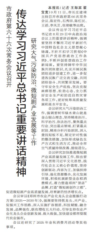 9月11日,市长庄建球主持召开市政府第66次常务会议,陈宏伟、石秀田、陈红民、王滔、李凤芝、张艳敏等出席。(今日《郑州日报》1版)