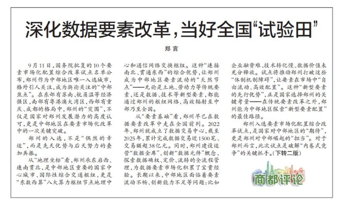 9月11日,国务院批复的10个要素市场化配置综合改革试点名单公布,郑州作为中部地区唯一入选城市,格外引人关注,成为舆论关注的“中部焦点”。在东部有苏南、杭甬温等经济强区,南部有粤港澳大湾区,西部有重庆、成都的格局中,郑州的“突围”,不仅是国家对郑州发展潜力的高度认可,更是中部地区在要素市场化改革中的一次关键突破。(今日《郑州日报》1版、2版)