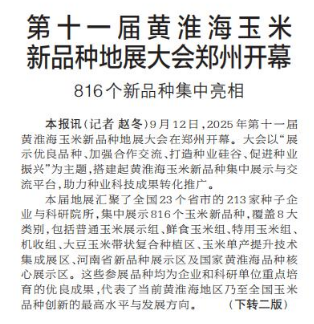 9月12日,2025年第十一届黄淮海玉米新品种地展大会在郑州开幕。大会以“展示优良品种、加强合作交流、打造种业硅谷、促进种业振兴”为主题,搭建起黄淮海玉米新品种集中展示与交流平台,助力种业科技成果转化推广。(今日《郑州日报》1版、2版)