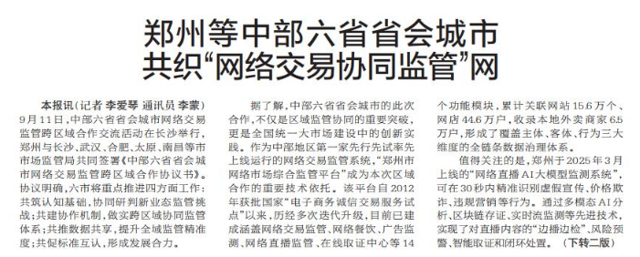 9月11日,中部六省省会城市网络交易监管跨区域合作交流活动在长沙举行,郑州与长沙、武汉、合肥、太原、南昌等市市场监管局共同签署《中部六省省会城市网络交易监管跨区域合作协议书》。协议明确,六市将重点推进四方面工作:共筑认知基础,协同研判新业态监管挑战;共建协作机制,做实跨区域协同监管体系;共推数据共享,提升全域监管精准度;共促标准互认,形成发展合力。(今日《郑州日报》1版、2版)