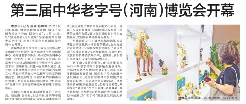 秋日的郑州,如意湖畔微风轻拂,捎来了全国各地老字号的“匠心味道”。9月12日,以“国货潮品·历久弥新”为主题的第三届中华老字号(河南)博览会在郑州国际会展中心开幕。(今日《郑州日报》2版)