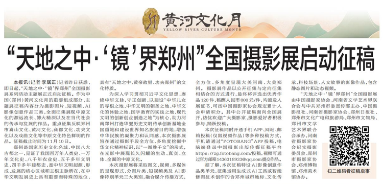 记者昨日获悉,即日起,“天地之中·‘镜’界郑州”全国摄影展系列活动主题展正式启动征稿。作为中国(郑州)黄河文化月的重要组成部分,主题展征稿内容分为摄影图片、短视频、AI影像创意作品三类,全面征集展现中原文化的源远流长、博大精深以及在当代社会的传承与发展的作品。重点征集反映郑州市嵩山文化、黄河文化、商都文化、功夫文化以及戏曲文化等中原文化特色鲜明的作品。征稿截止时间为11月10日。(今日《郑州日报》4版)