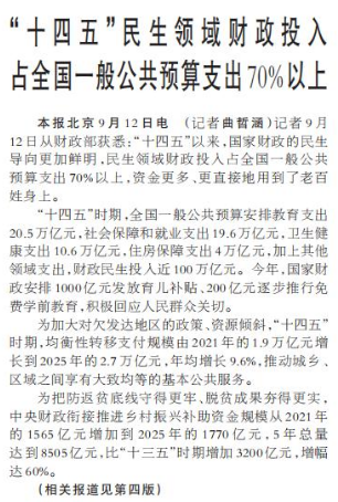 记者9月12日从财政部获悉:“十四五”以来,国家财政的民生导向更加鲜明,民生领域财政投入占全国一般公共预算支出70%以上,资金更多、更直接地用到了老百姓身上。(今日《人民日报》1版、4版)