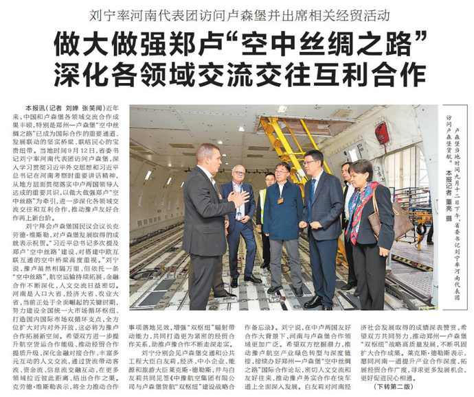 近年来,中国和卢森堡各领域交流合作成果丰硕,特别是郑州—卢森堡“空中丝绸之路”已成为国际合作的重要通道、发展联动的坚实桥梁、联结民心的宝贵纽带。当地时间9月12日,省委书记刘宁率河南代表团访问卢森堡,深入学习贯彻习近平外交思想和习近平总书记在河南考察时重要讲话精神,从地方层面贯彻落实中卢两国领导人达成的重要共识,以做大做强郑卢“空中丝路”为牵引,进一步深化各领域交流交往和互利合作,推动豫卢友好合作再上新台阶。(今日《河南日报》1版、2版)