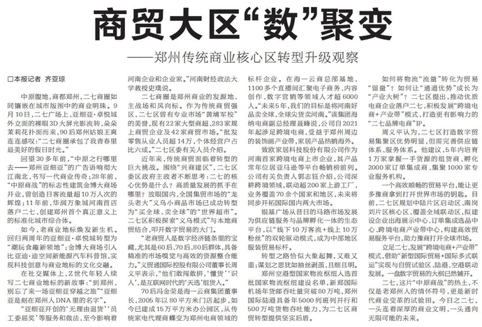 中原腹地,商都郑州,二七商圈如同镶嵌在城市版图中的商业明珠。9月10日,二七广场上,亚细亚·卓悦城外立面的裸眼3D大屏光影流转,朵朵茉莉花扑面而来,90后郑州姑娘王爽连连感叹:“二七商圈承包了我青春里最美好的假日时光。”(今日《河南日报》2版)