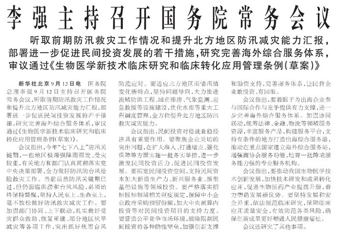 听取前期防汛救灾工作情况和提升北方地区防汛减灾能力汇报,部署进一步促进民间投资发展的若干措施,研究完善海外综合服务体系,审议通过《生物医学新技术临床研究和临床转化应用管理条例(草案)》(今日《人民日报》1版)