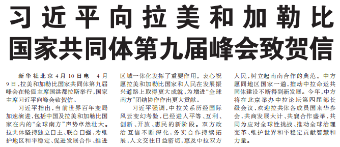4月9日,拉美和加勒比国家共同体第九届峰会在轮值主席国洪都拉斯举行,国家主席习近平向峰会致贺信。(今日《人民日报》1版)
