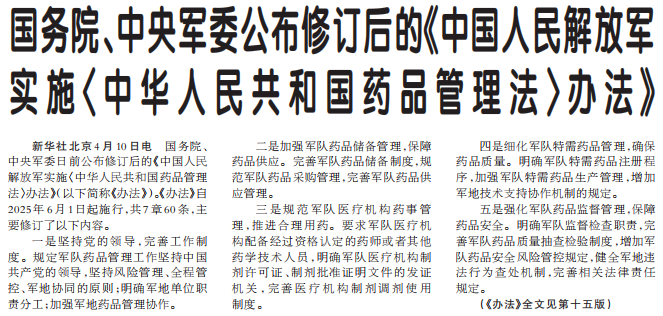 国务院、中央军委日前公布修订后的《中国人民解放军实施〈中华人民共和国药品管理法〉办法》(以下简称《办法》)。《办法》自2025年6月1日起施行,共7章60条,主要修订了以下内容。(今日《人民日报》1版、15版)