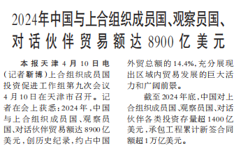 上合组织成员国投资促进工作组第九次会议4月10日在天津市召开。记者在会上获悉:2024年,中国与上合组织成员国、观察员国、对话伙伴贸易额达8900亿美元,创历史纪录,约占中国外贸总额的14.4%,充分展现出区域内贸易发展的巨大活力和广阔前景。(今日《人民日报》1版)