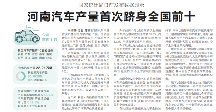 河南汽车产量首次跻身全国汽车产量10强。国家统计局日前发布的数据显示,今年前两个月,我国汽车产量前10名的省份分别是安徽、广东、江苏、山东、重庆、陕西、浙江、湖南、河南和北京。(今日《河南日报》1版)
