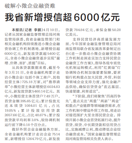 4月10日,记者从国家金融监督管理总局河南监管局获悉,我省金融监管部门和相关金融机构持续推进小微企业融资协调工作机制落地,新增授信超6000亿元,新发放贷款超5400亿元,全省小微企业融资逐步实现“量增、价降、面扩、质提”目标。(今日《河南日报》1版)