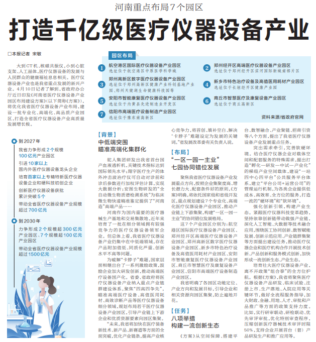 大到CT机、核磁共振仪,小到心脏支架、人工晶体,医疗仪器设备的发展与人民群众的健康福祉息息相关。医疗仪器设备产业也是我省重点发展的新兴产业。4月10日记者了解到,省政府办公厅近日印发《河南省医疗仪器设备产业园区布局建设方案》,将优化我省医疗仪器设备产业布局,建设一批专业化、高端化、高品质产业园区,打造全省医疗仪器设备产业高质量发展增长极。(今日《河南日报》2版)