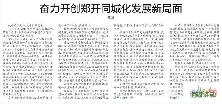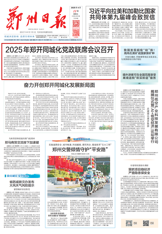4月10日,2025年郑开同城化党政联席会议召开,郑开同城化发展进入新阶段,区域协调发展开启新篇章。(今日《郑州日报》1版)