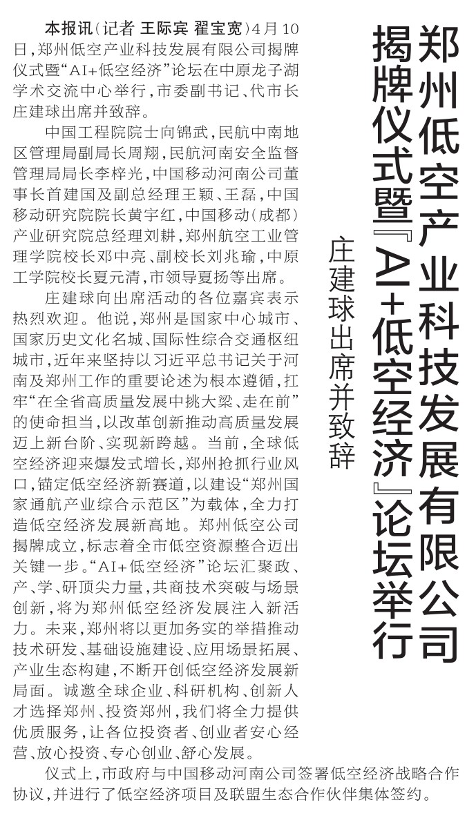 4月10日,郑州低空产业科技发展有限公司揭牌仪式暨“AI+低空经济”论坛在中原龙子湖学术交流中心举行,市委副书记、代市长庄建球出席并致辞。(今日《郑州日报》1版)