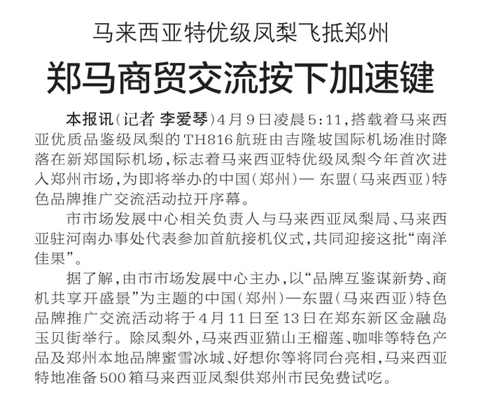 4月9日凌晨5:11,搭载着马来西亚优质品鉴级凤梨的TH816航班由吉隆坡国际机场准时降落在新郑国际机场,标志着马来西亚特优级凤梨今年首次进入郑州市场,为即将举办的中国(郑州)— 东盟(马来西亚)特色品牌推广交流活动拉开序幕。(今日《郑州日报》1版)