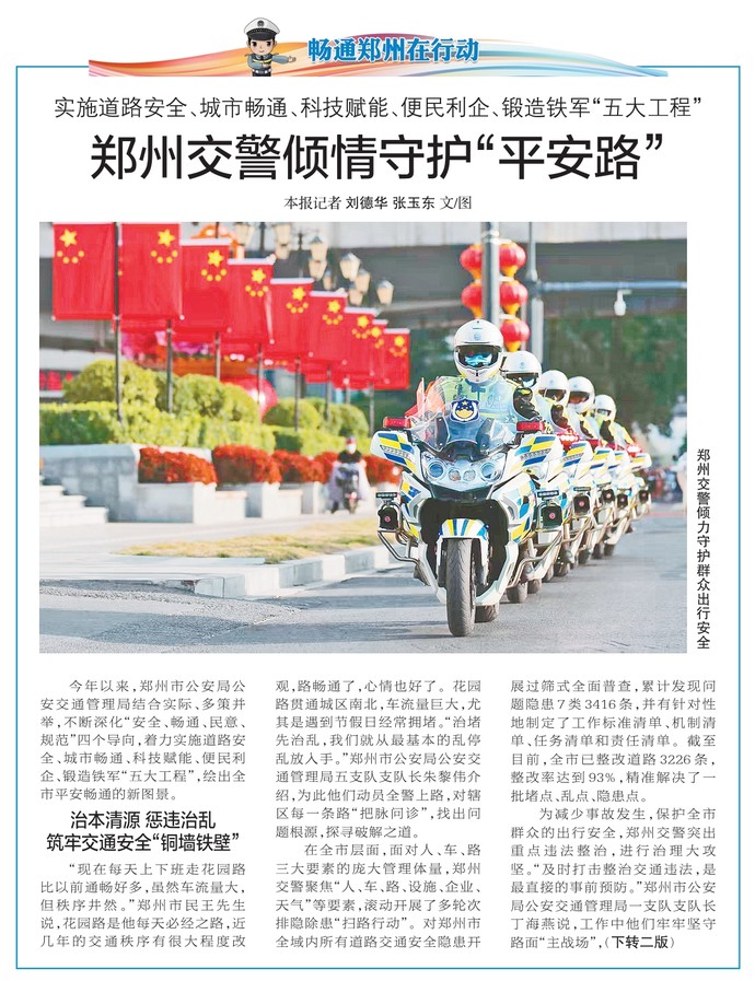 今年以来,郑州市公安局公安交通管理局结合实际、多策并举,不断深化“安全、畅通、民意、规范”四个导向,着力实施道路安全、城市畅通、科技赋能、便民利企、锻造铁军“五大工程”,绘出全市平安畅通的新图景。(今日《郑州日报》1版、2版)