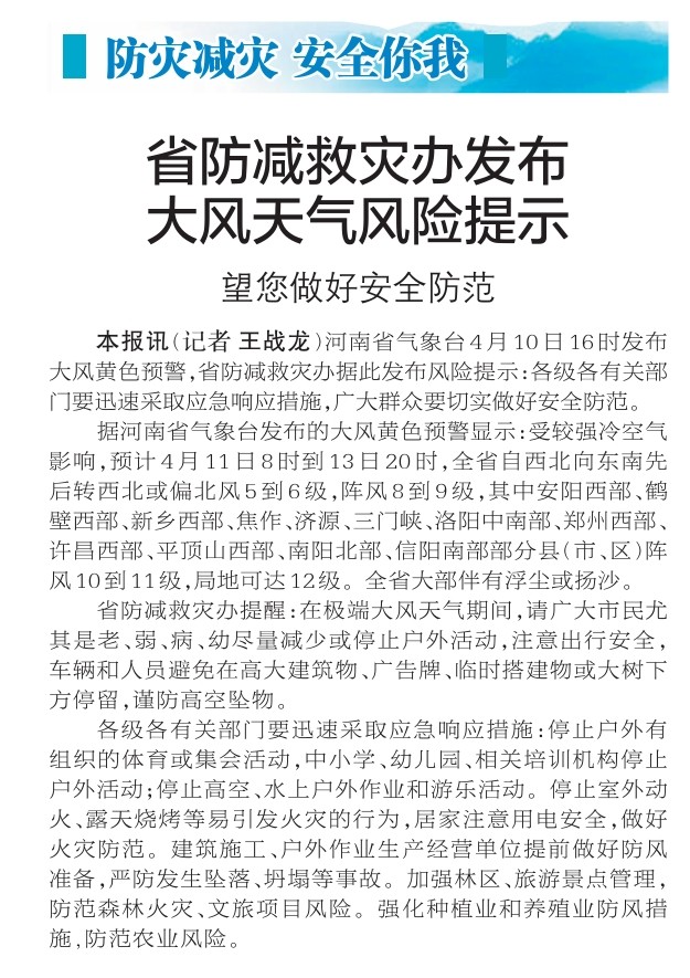 河南省气象台4月10日16时发布大风黄色预警,省防减救灾办据此发布风险提示:各级各有关部门要迅速采取应急响应措施,广大群众要切实做好安全防范。(今日《郑州日报》1版)