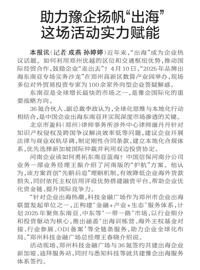 近年来,“出海”成为企业热议话题。如何利用郑州优越的区位和交通枢纽优势,推动国际经贸合作,鼓励企业“走出去”?4月10日,“2025年品牌出海东南亚专场实务沙龙”在郑州高新区数算产业园举办,现场多位对外贸易投资专家为100余家外向型企业答疑解惑。(今日《郑州日报》2版)