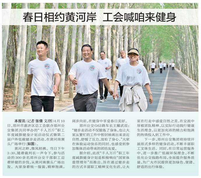 4月10日,郑州市惠济区总工会联合郑州公交集团共同举办的“千人万斤”职工年度减脂健身计划启动仪式暨第二届户外低碳健步走活动,在黄河南裹头广场举行。(今日《郑州日报》2版)