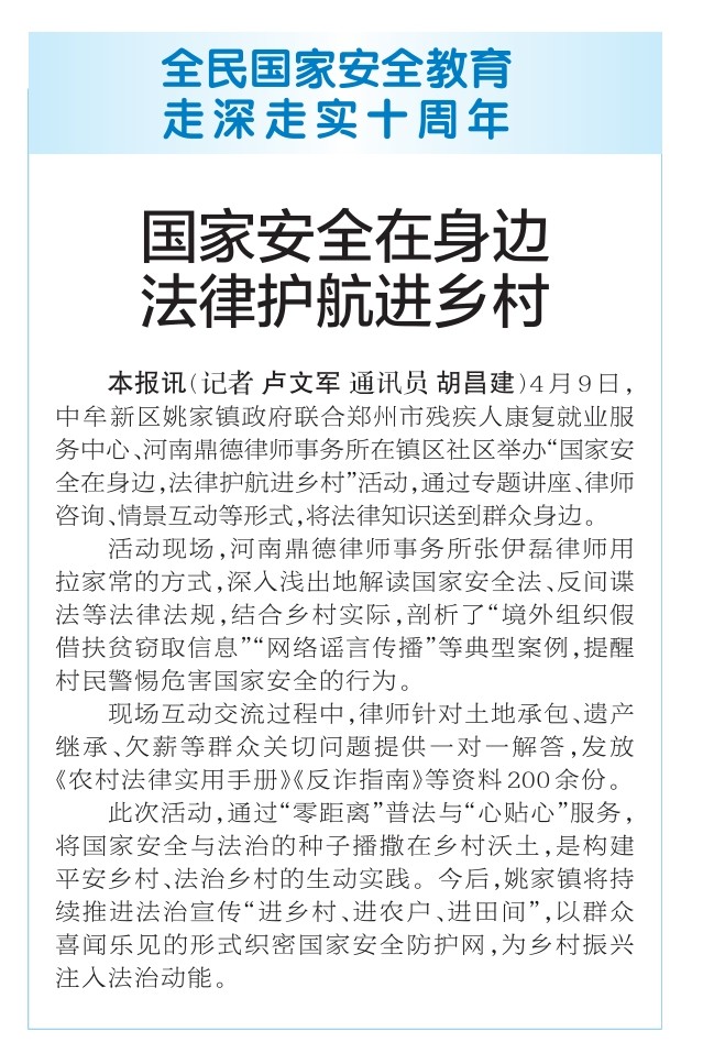 4月9日,中牟新区姚家镇政府联合郑州市残疾人康复就业服务中心、河南鼎德律师事务所在镇区社区举办“国家安全在身边,法律护航进乡村”活动,通过专题讲座、律师咨询、情景互动等形式,将法律知识送到群众身边。(今日《郑州日报》2版)