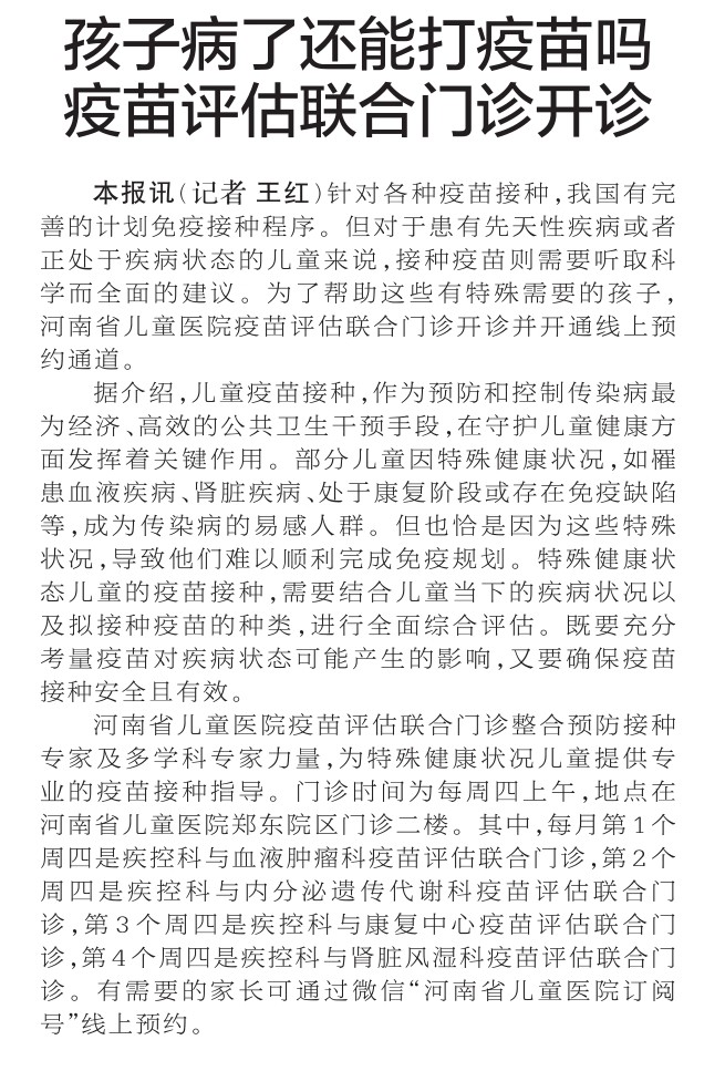 针对各种疫苗接种,我国有完善的计划免疫接种程序。但对于患有先天性疾病或者正处于疾病状态的儿童来说,接种疫苗则需要听取科学而全面的建议。为了帮助这些有特殊需要的孩子,河南省儿童医院疫苗评估联合门诊开诊并开通线上预约通道。(今日《郑州日报》2版)