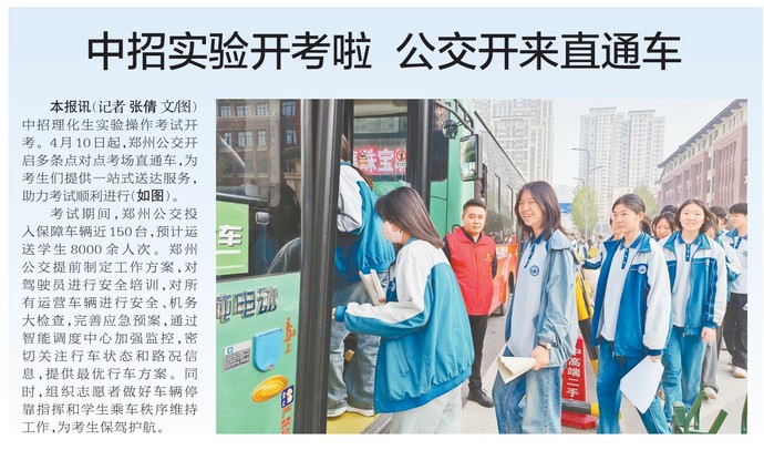 中招理化生实验操作考试开考。4月10日起,郑州公交开启多条点对点考场直通车,为考生们提供一站式送达服务,助力考试顺利进行。(今日《郑州日报》2版)