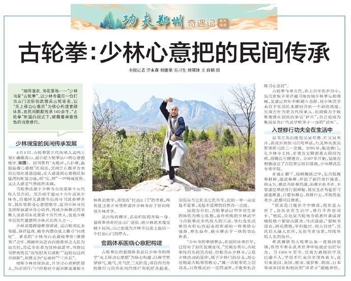 “细雨湿衣,闲花落地……”少林内家“古轮拳”,以少林寺最后一位打出山门还俗的武僧吴古轮命名,以“无上禅功心意把”为核心构建套路体系,在民间默默传承140余年。“古轮拳”刚猛的招式下,暗藏着禅意悠悠的诗意修行。(今日《郑州日报》5版)