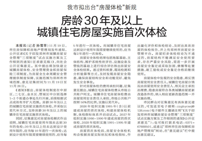 11月19日,市住房保障和房地产管理局发布通知,公开征求《关于印发郑州市城镇房屋安全管理“三项制度”试点实施方案及工作细则的通知(征求意见稿)》,向社会公开征集意见。其中提出将加快建立城镇房屋体检、安全管理资金和房屋保险三项制度,为房屋全生命周期安全管理提供制度保障,实施范围为郑州市市域范围,意见征集时间为11月19日至11月26日。(今日《郑州日报》1版)