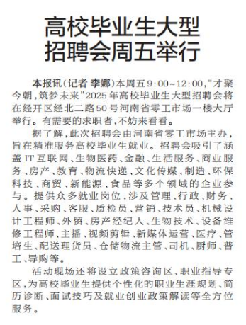 本周五9:00~12:00,“才聚今朝,筑梦未来”2025年高校毕业生大型招聘会将在经开区经北二路50号河南省零工市场一楼大厅举行。有需要的求职者,不妨来看看。(今日《郑州日报》1版)