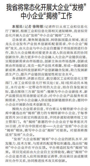 记者昨日从省工业和信息化厅了解到,根据工业和信息化部相关通知精神,我省拟常态化开展大企业“发榜”中小企业“揭榜”工作。(今日《郑州日报》1版)