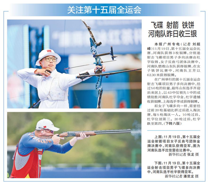 11月19日,第十五届全运会比赛,河南队获得3枚银牌,分别是射击飞碟项目男子多向决赛由杜宇取得,女子反曲弓团体决赛中,河南队惜败山东队获得银牌,在女子铁饼比赛中,河南队王芳以62.30米获得银牌。(今日《郑州日报》1版、8版)