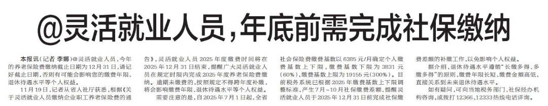 @灵活就业人员,今年的养老保险费缴纳截止日期为12月31日,请记好截止日期,否则有可能会影响您的缴费年限、退休待遇水平等个人权益。(今日《郑州日报》2版)