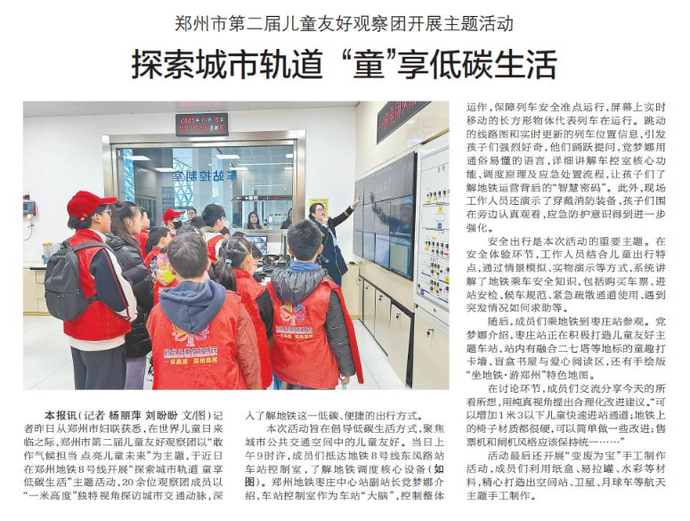 记者昨日从郑州市妇联获悉,在世界儿童日来临之际,郑州市第二届儿童友好观察团以“敢作气候担当 点亮儿童未来”为主题,于近日在郑州地铁8号线开展“探索城市轨道 童享低碳生活”主题活动,20余位观察团成员以“一米高度”独特视角探访城市交通动脉,深入了解地铁这一低碳、便捷的出行方式。(今日《郑州日报》2版)