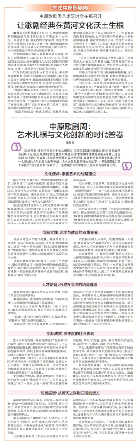 11月19日,中原歌剧周系列演出活动艺术研讨会在河南艺术中心举行。来自音乐界、戏剧界的专家学者、高校代表及文化管理部门负责人齐聚一堂,围绕歌剧周的艺术实践、育人成果与文化价值展开深入探讨,为中原歌剧艺术的未来发展建言献策。(今日《郑州日报》8版)