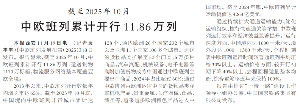 《中欧班列发展报告(2025)》18日发布。报告显示,截至2025年10月,中欧班列累计开行11.86万列,运送货物1170万标箱,物流服务网络基本覆盖亚欧全境。(今日《人民日报》2版)