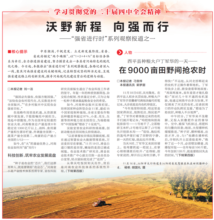 中原潮涌,千帆竞发。立足新发展阶段,省委、省政府锚定“两个确保”,以“1+2+4+N”目标任务体系为牵引,全力推进强省建设,努力探索走出一条具有河南特色的现代化之路。今日起,本报推出“强省进行时”系列观察报道,各路记者深入一线,聚焦河南强省建设的关键领域,记录转型攻坚的鲜活足迹,呈现强省建设路上的创新实践,探寻河南现代化建设背后的逻辑与动能。