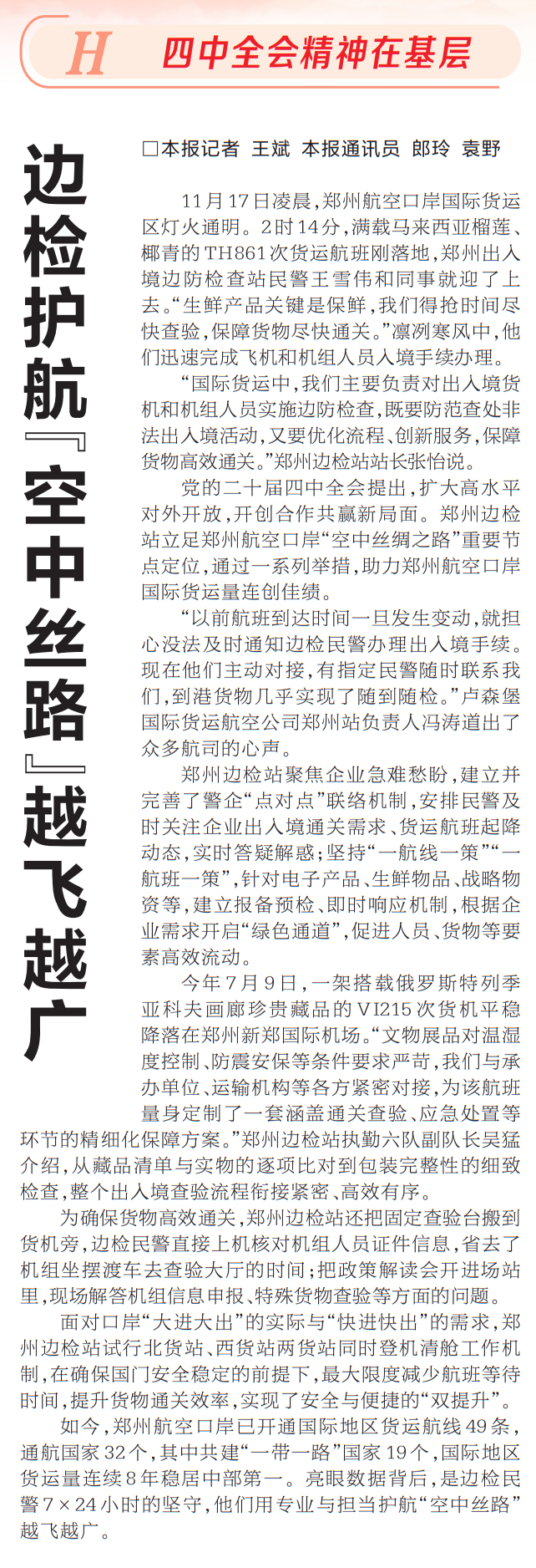 11月17日凌晨,郑州航空口岸国际货运区灯火通明。2时14分,满载马来西亚榴莲、椰青的TH861次货运航班刚落地,郑州出入境边防检查站民警王雪伟和同事就迎了上去。“生鲜产品关键是保鲜,我们得抢时间尽快查验,保障货物尽快通关。”凛冽寒风中,他们迅速完成飞机和机组人员入境手续办理。(今日《河南日报》2版)