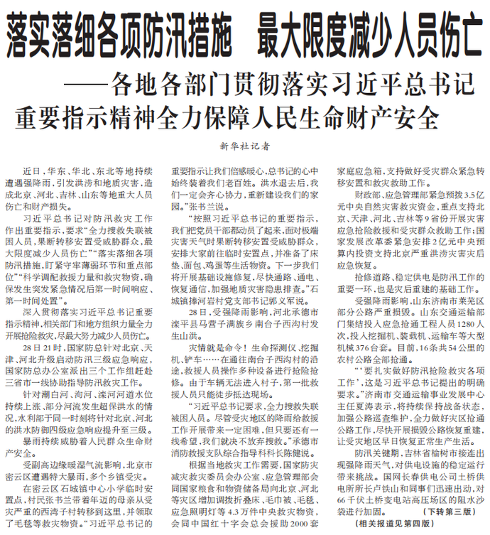 近日,华东、华北、东北等地持续遭遇强降雨,引发洪涝和地质灾害,造成北京、河北、吉林、山东等地重大人员伤亡和财产损失。(今日《人民日报》1版、3版、4版)