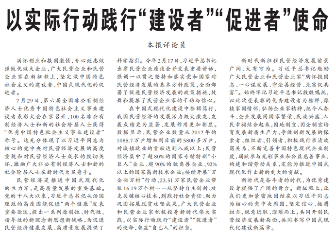 满怀创业和报国激情,专心致志做强做优做大企业,广大民营企业和民营企业家在新征程上,坚定做中国特色社会主义的建设者、中国式现代化的促进者。(今日《人民日报》1版)