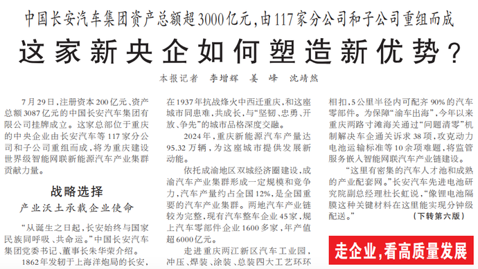 7月29日,注册资本200亿元、资产总额3087亿元的中国长安汽车集团有限公司挂牌成立。这家总部位于重庆的中央企业由长安汽车等117家分公司和子公司重组而成,将为重庆建设世界级智能网联新能源汽车产业集群贡献力量。(今日《人民日报》1版、6版)