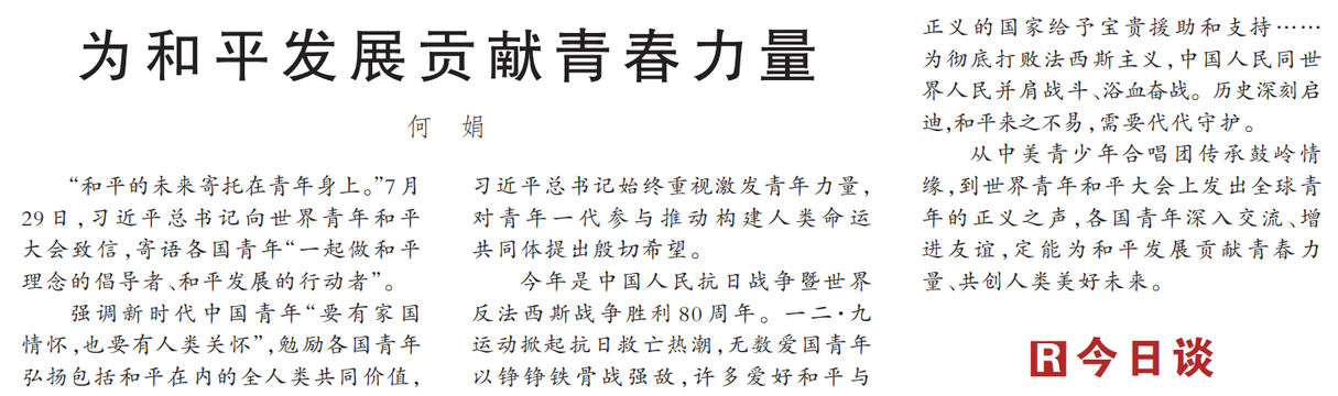 “和平的未来寄托在青年身上。”7月29日,习近平总书记向世界青年和平大会致信,寄语各国青年“一起做和平理念的倡导者、和平发展的行动者”。(今日《人民日报》1版)