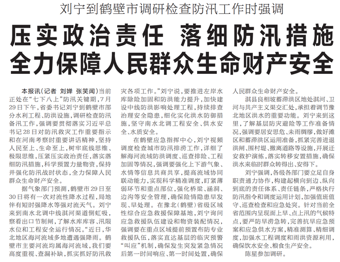 当前正处在“七下八上”防汛关键期,7月29日下午,省委书记刘宁到鹤壁市部分水利工程、防洪设施,调研检查防汛备汛工作,强调要贯彻落实习近平总书记28日对防汛救灾工作重要指示和在河南考察时重要讲话精神,坚持人民至上、生命至上,树牢底线思维、极限思维,压紧压实政治责任,落实落细防汛措施,科学预置力量物资,保持并强化防汛战时状态,全力保障人民群众生命财产安全。(今日《河南日报》1版)