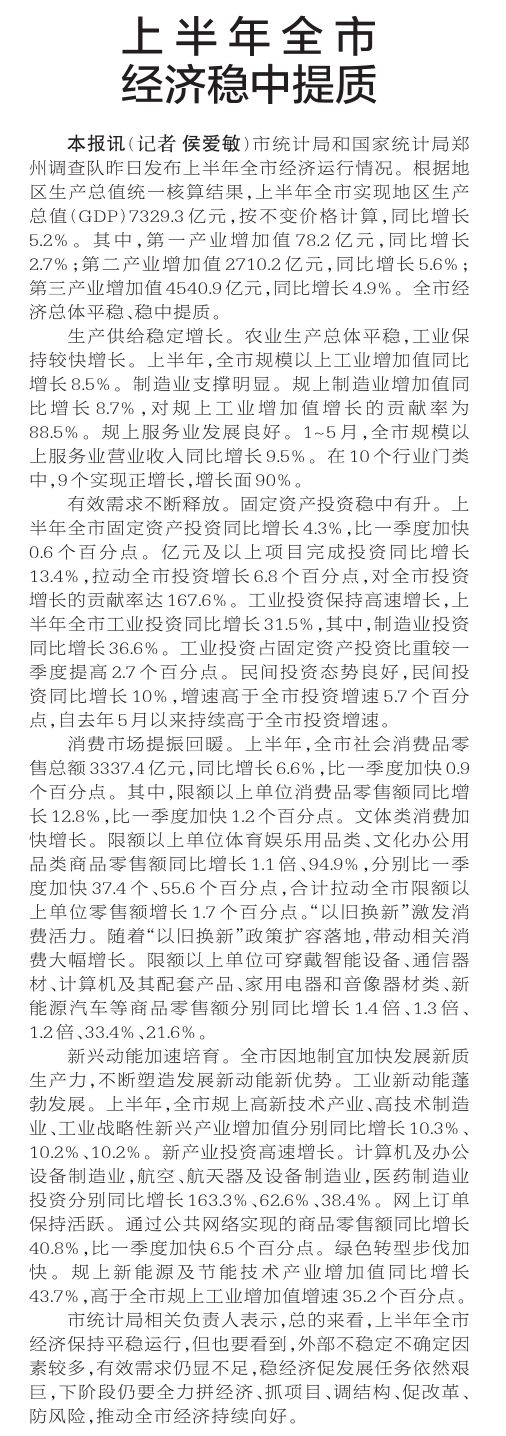 市统计局和国家统计局郑州调查队昨日发布上半年全市经济运行情况。根据地区生产总值统一核算结果,上半年全市实现地区生产总值(GDP)7329.3亿元,按不变价格计算,同比增长5.2%。其中,第一产业增加值78.2亿元,同比增长2.7%;第二产业增加值2710.2亿元,同比增长5.6%;第三产业增加值4540.9亿元,同比增长4.9%。全市经济总体平稳、稳中提质。(今日《郑州日报》1版)