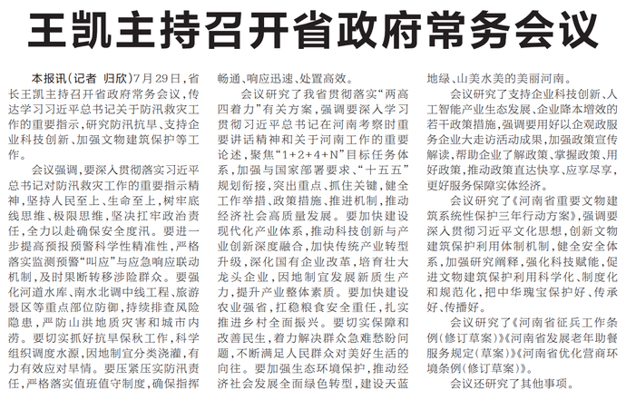 7月29日,省长王凯主持召开省政府常务会议,传达学习习近平总书记关于防汛救灾工作的重要指示,研究防汛抗旱、支持企业科技创新、加强文物建筑保护等工作。(今日《河南日报》1版)