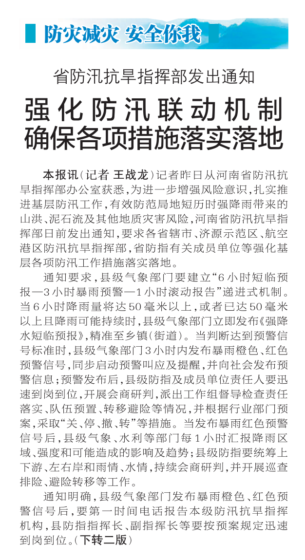 记者昨日从河南省防汛抗旱指挥部办公室获悉,为进一步增强风险意识,扎实推进基层防汛工作,有效防范局地短历时强降雨带来的山洪、泥石流及其他地质灾害风险,河南省防汛抗旱指挥部日前发出通知,要求各省辖市、济源示范区、航空港区防汛抗旱指挥部,省防指有关成员单位等强化基层各项防汛工作措施落实落地。(今日《郑州日报》1版、2版)