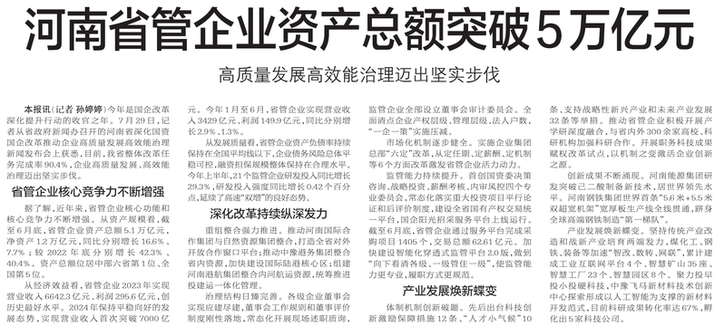 今年是国企改革深化提升行动的收官之年。7月29日,记者从省政府新闻办召开的河南省深化国资国企改革推动企业高质量发展高效能治理新闻发布会上获悉,目前,我省整体改革任务完成率90.4%,企业高质量发展、高效能治理迈出坚实步伐。(今日《郑州日报》2版)
