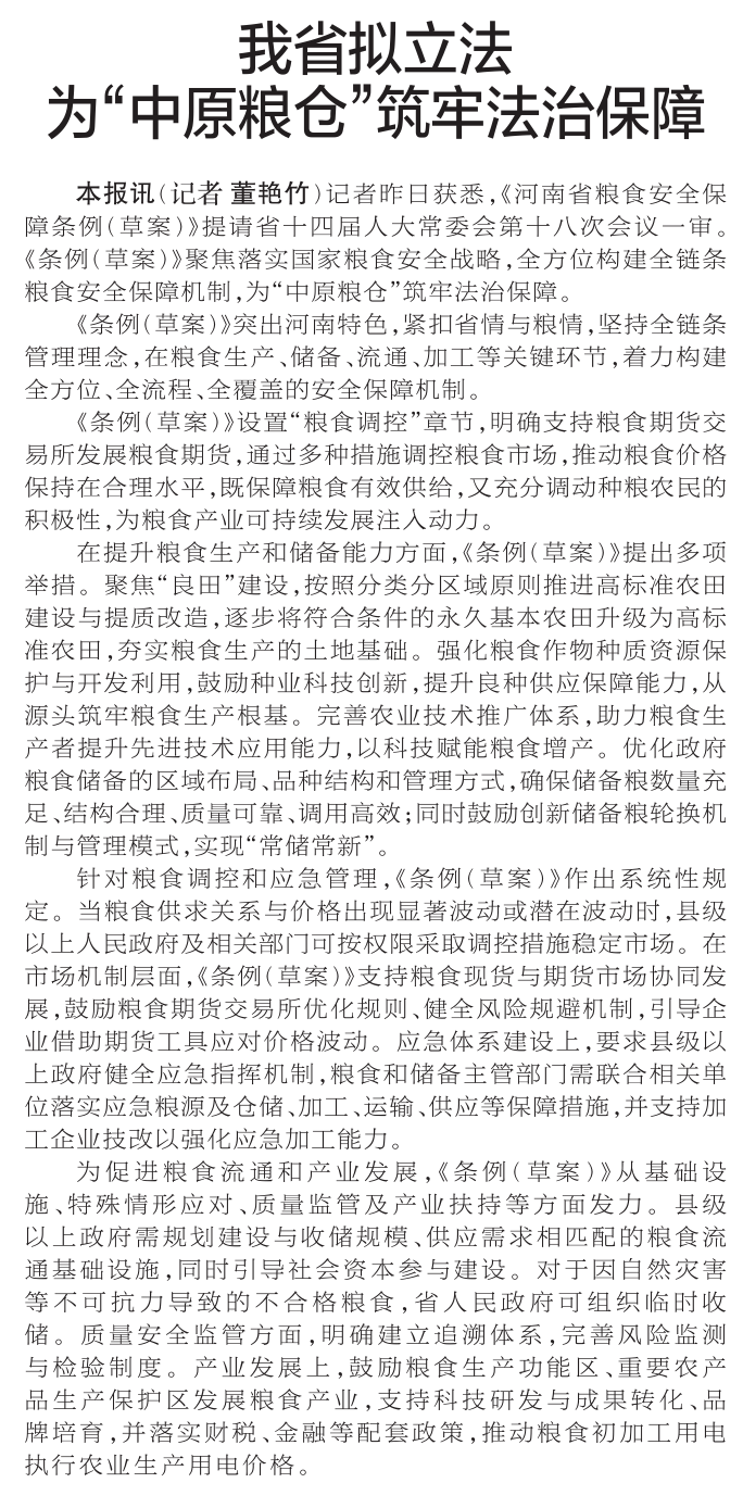 记者昨日获悉,《河南省粮食安全保障条例(草案)》提请省十四届人大常委会第十八次会议一审。《条例(草案)》聚焦落实国家粮食安全战略,全方位构建全链条粮食安全保障机制,为“中原粮仓”筑牢法治保障。(今日《郑州日报》2版)