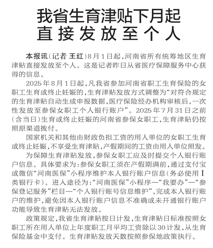 8月1日起,河南省所有统筹地区生育津贴直接发放至个人。这是记者昨日从省医疗保障服务中心获得的信息。(今日《郑州日报》2版)