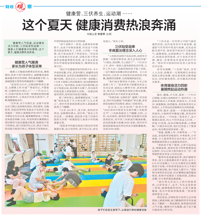 健康营人气旺盛,运动健身活力四射,三伏贴受到追捧……随着人们健康意识的增强,这个夏天,健康消费热浪奔涌。(今日《郑州日报》4版)