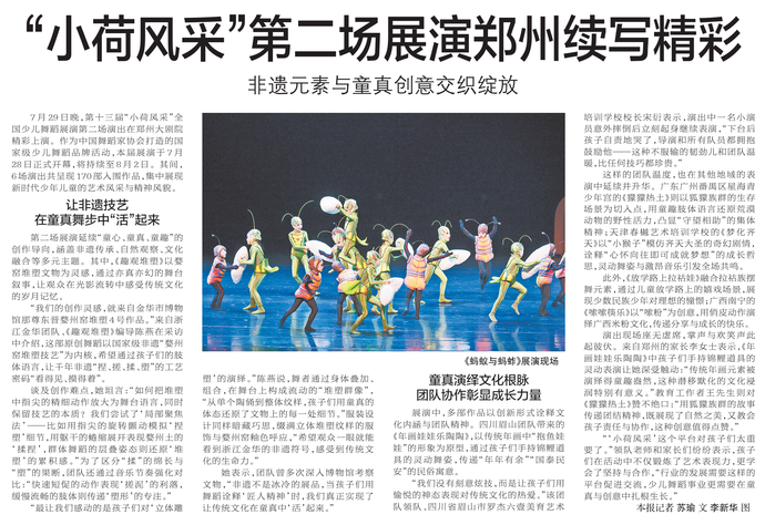 7月29日晚,第十三届“小荷风采”全国少儿舞蹈展演第二场演出在郑州大剧院精彩上演。作为中国舞蹈家协会打造的国家级少儿舞蹈品牌活动,本届展演于7月28日正式开幕,将持续至8月2日。其间,6场演出共呈现170部入围作品,集中展现新时代少年儿童的艺术风采与精神风貌。(今日《郑州日报》8版)